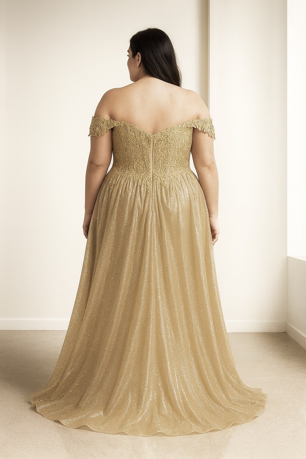 Elegantné spoločenské šaty v zlatej farbe sú navrhnuté pre ženy, ktoré hľadajú spojenie luxusu a pohodlia. Dlhý áčkový strih krásne predlžuje postavu, zatiaľ čo bohatá sukňa dodáva celému outfitu honosný vzhľad. Vrch šiat zdobia čipkované detaily a spadnuté ramená, ktoré pôsobia žensky a romanticky – ideálna voľba na ples, stužkovú, večernú oslavu či svadbu. Šaty sú na zips, ale v prípade potreby sa dajú upraviť aj na šnurovanie pre lepšie prispôsobenie postave.