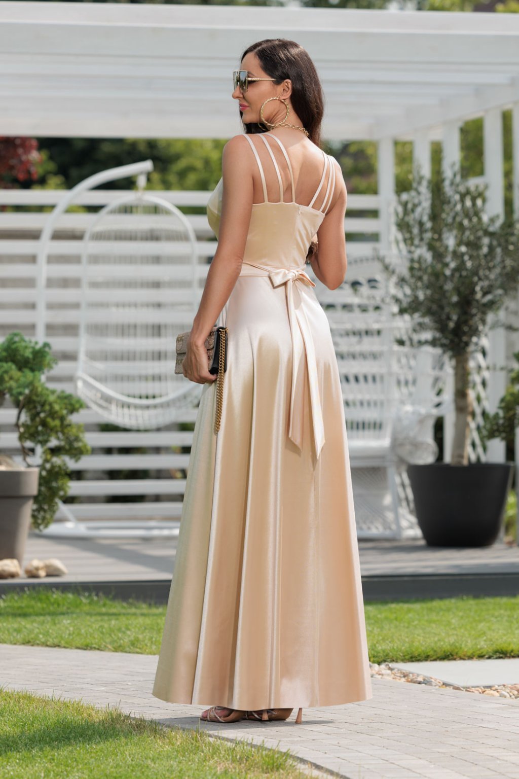 Elegantné dlhé zlaté saténové šaty, sú vyrobené z vysoko kvalitnej látky s jemným leskom. Výstrih do V, viazanie v páse a skrytý zips na chrbte podčiarkujú ženskú siluetu, zatiaľ čo rozparok dodáva šatám zvodný efekt. Ideálne na stužkovú, ples, svadbu, oslavu či večierok, kde chceš zažiariť eleganciou a štýlom.