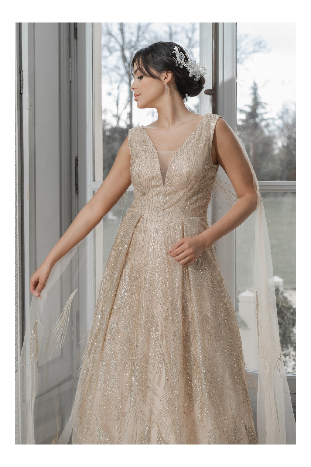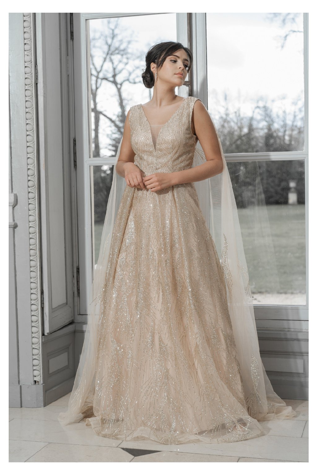Tieto dlhé zlaté šaty s trblietavými detailmi sú Ideálne na svadby, plesy alebo stužkové. Hlboký V-výstrih vpredu a vzadu pridáva šatám sofistikovaný nádych, zatiaľ čo jemný tyl s lesklým vzorom vytvára dojem luxusu.