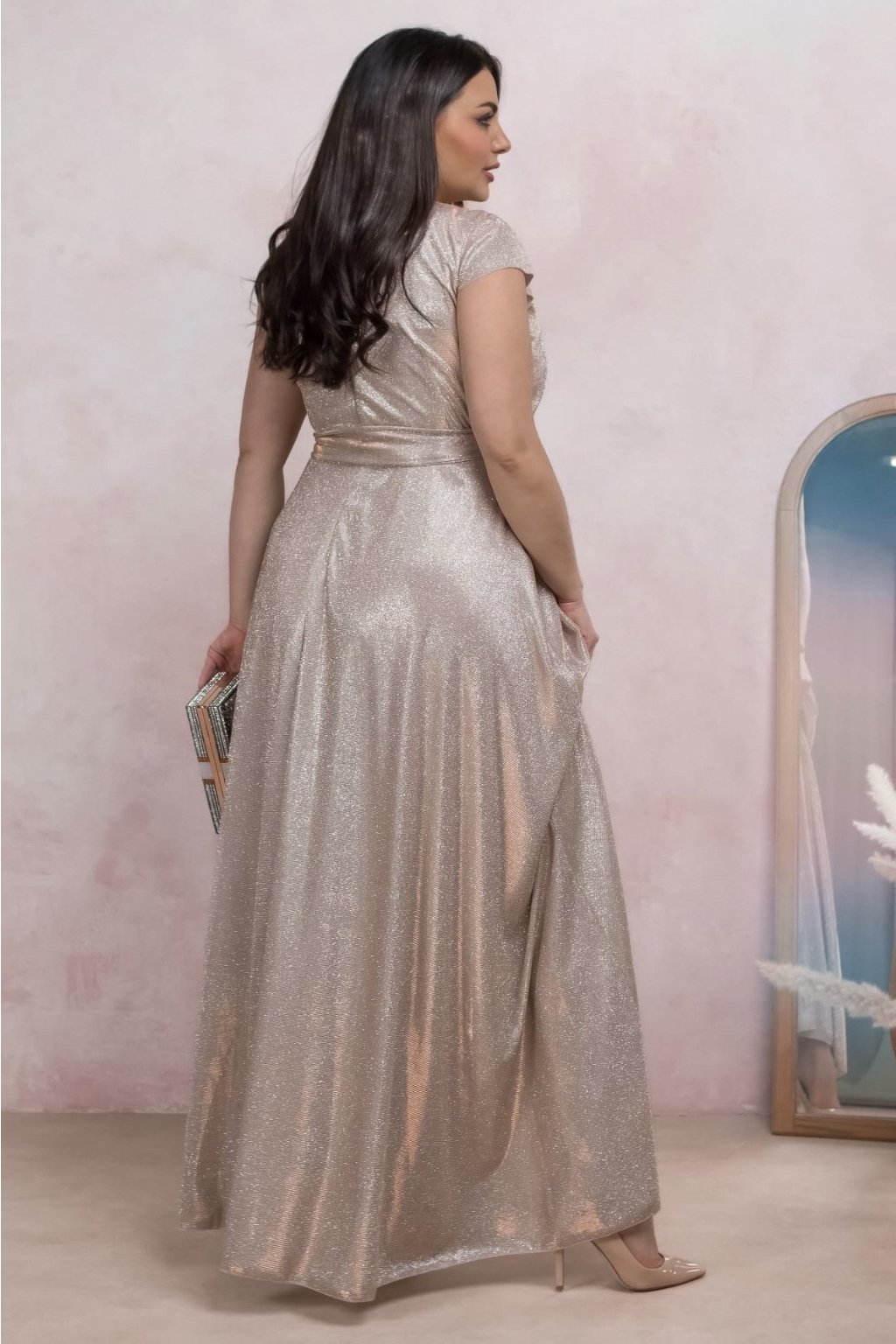 Elegantné trblietavé plus-size spoločenské šaty pre moletky v zlatom odtieni sú ideálnou voľbou pre ženy, ktoré hľadajú elegantné šaty na špeciálne príležitosti. Zavinovací vrch s krátkym rukávom a viazanie v páse lichotí postave a opticky ju zoštíhľuje. Dlhá áčková sukňa s rozparkom pôsobí žensky a elegantne – perfektné na ples, svadbu, stužkovú alebo oslavu.