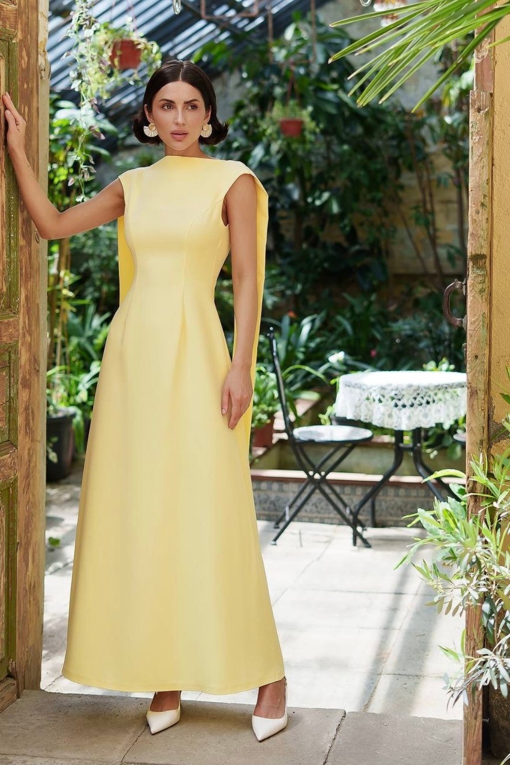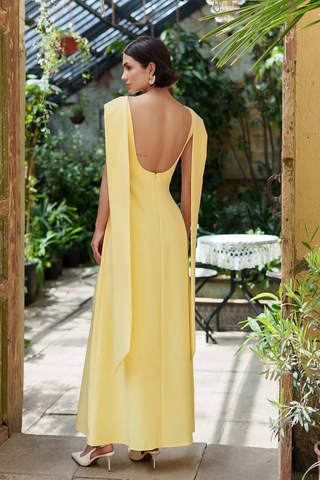 Elegantné žlté midi šaty sú ušité z kvalitného kostýmového krepu prémiovej triedy, ktorý pôsobí luxusne a krásne drží tvar. Zaujmú odhaleným chrbtom s viazaním na mašľu, ktoré dodáva ženský a romantický efekt. Jednoduchý a rovný dlhý strih opticky predlžuje postavu, vďaka čomu sú tieto šaty ideálnou voľbou na svadby, oslavy či letné spoločenské udalosti.